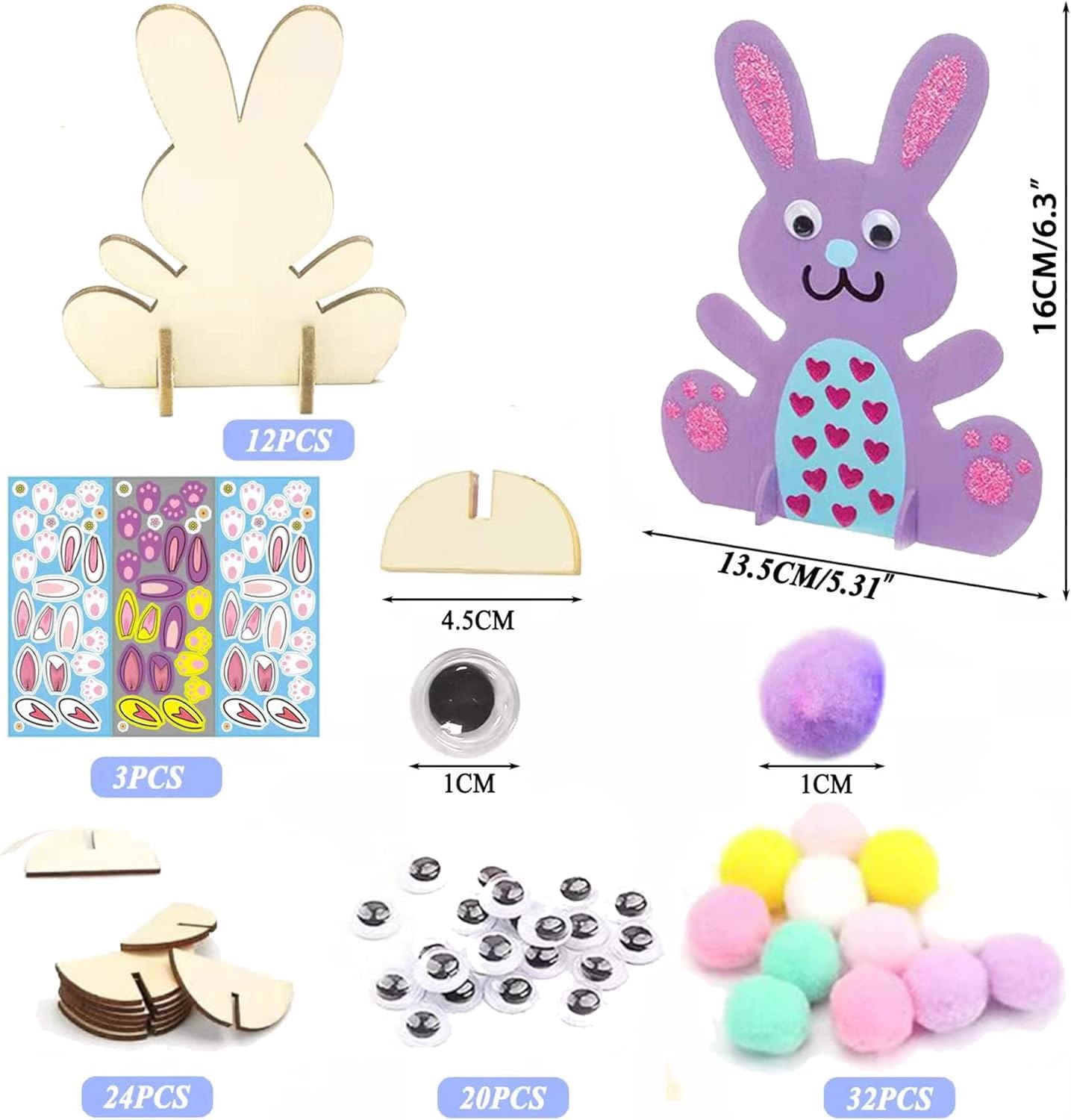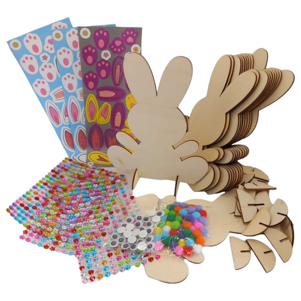 Zestaw do majsterkowania dla dzieci, który pozwala na kreatywne malowanie i dekorowanie drewnianych królików. Zawiera różnorodne elementy, takie jak kolorowe mini pompony, wielkie oczka, naklejki diamentowe i inne dekoracje, co zapewnia dzieciom mnóstwo zabawy i rozwija ich zdolności manualne.