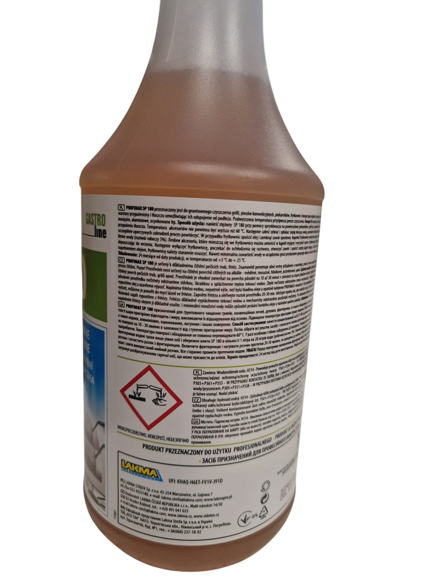 Lakma Profimax SP180 1L - czyszczenie grilli. PROFIMAX SP 180 przeznaczony jest do gruntownego czyszczenia grilli, pieców konwekcyjnych, piekarników, frytkownic i innego typu urządzeń, pracujących w wysokich temperaturach. Znakomicie czyści grube warstwy przypalenizny i tłuszczu umożliwiając ich łatwe i szybkie usunięcie z powierzchni. . łatwo i szybko usuwa silne przypalenia i tłuszcz posiada dopuszczenie do styczności z żywnością idealny dla urządzeń pracujących w wysokich temperaturach. SPOSÓB UŻYCIA Gotowy do użycia. Piece, piekarniki, grille: Nanieść skoncentrowany środek na powierzchnie nagrzane do temperatury maks. 60°C i pozostawić na 10 - 30 minut (w zależności od stopnia przypalenia tłuszczu), następnie dokładnie spłukać czysta woda. Pozostałe resztki zabrudzeń usunąć mechanicznie. W przypadku szczególnie uporczywych zabrudzeń proces powtórzyć. Koncentrat. Frytkownice: Stężenie 5 %. Spuścić olej i zamknąć zawór spustowy. Napełnić frytkownice woda, nieco powyżej poziomu oleju, ostrożnie władz roztwór SP 180. Drobne akcesoria, które mieszczą się we frytkownicy, można umieścić w kąpieli myjącej i wyczyścić razem z frytkownicą. Włączyć frytkownice i podgrzewać roztwór przez 20 - 30 minut nie dopuszczając do wrzenia. Następnie wyłączyć, poczekać do ochłodzenia, otworzyć zawór i spuścić roztwór. Całość starannie spłukać bieżącą wodą. UWAGA! Przed ponownym napełnieniem olejem, frytkownice należy starannie osuszyć. Nawet minimalna zawartość wody w urządzeniu powoduje pryskanie gorącego oleju, co może skutkować oparzeniami. UWAGA! Nie stosować na powierzchnie wrażliwe na alkalia (miedziane, mosiężne, aluminiowe, ocynkowane, itp.). Cena dotyczy 1 szt. 1 litr.