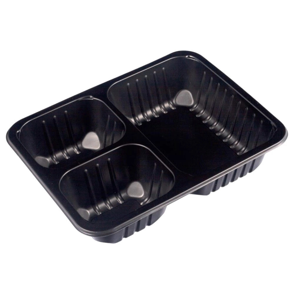 Pojemnik wykonany z trwałego tworzywa odpornego na wysokie temperatury, przystosowany do zgrzewu folią. Trójdzielna konstrukcja pozwala na wygodne oddzielenie składników potraw, zachowując ich smak, strukturę i świeżość.