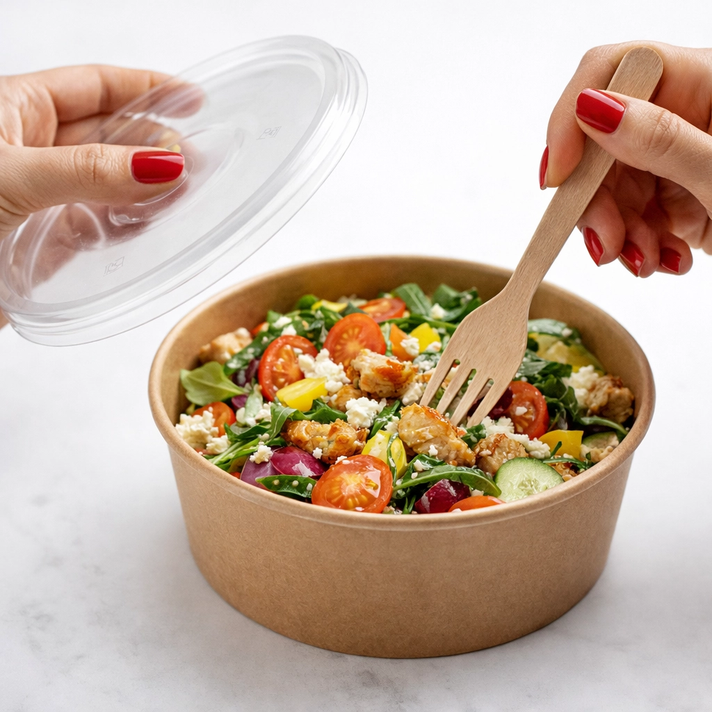 Okrągła pokrywka wykonana z przezroczystego tworzywa PET została zaprojektowana jako praktyczne zamknięcie do papierowych misek gastronomicznych o pojemności 1300 ml. Transparentny materiał pozwala na wygodne prezentowanie zawartości opakowania, co jest szczególnie przydatne w restauracjach, barach sałatkowych, cateringu oraz sprzedaży dań na wynos.