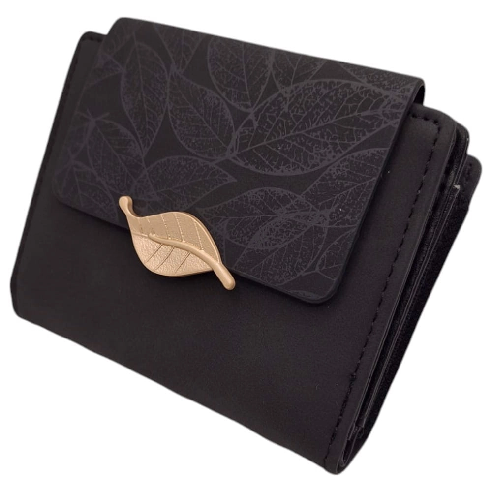 Elegancki portfel damski: emblemat z podpisem w kolorze jasnego złota pięknie rekompensuje nasz portfel z liśćmi.