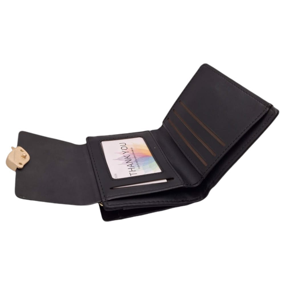 Duża pojemność: 1 komora na banknoty, 1 komora z oknem, 5 miejsc na karty, 1 tylna kieszeń zapinana na zamek błyskawiczny używana jako portfel