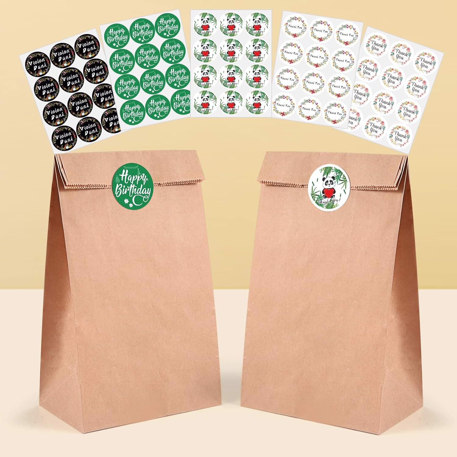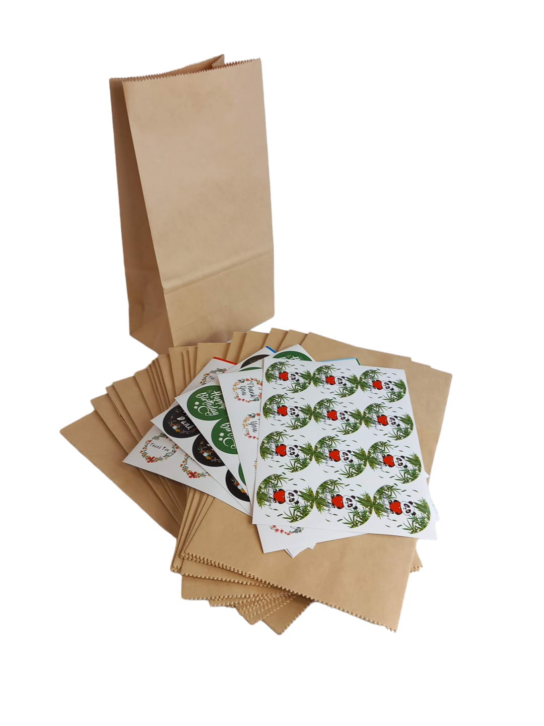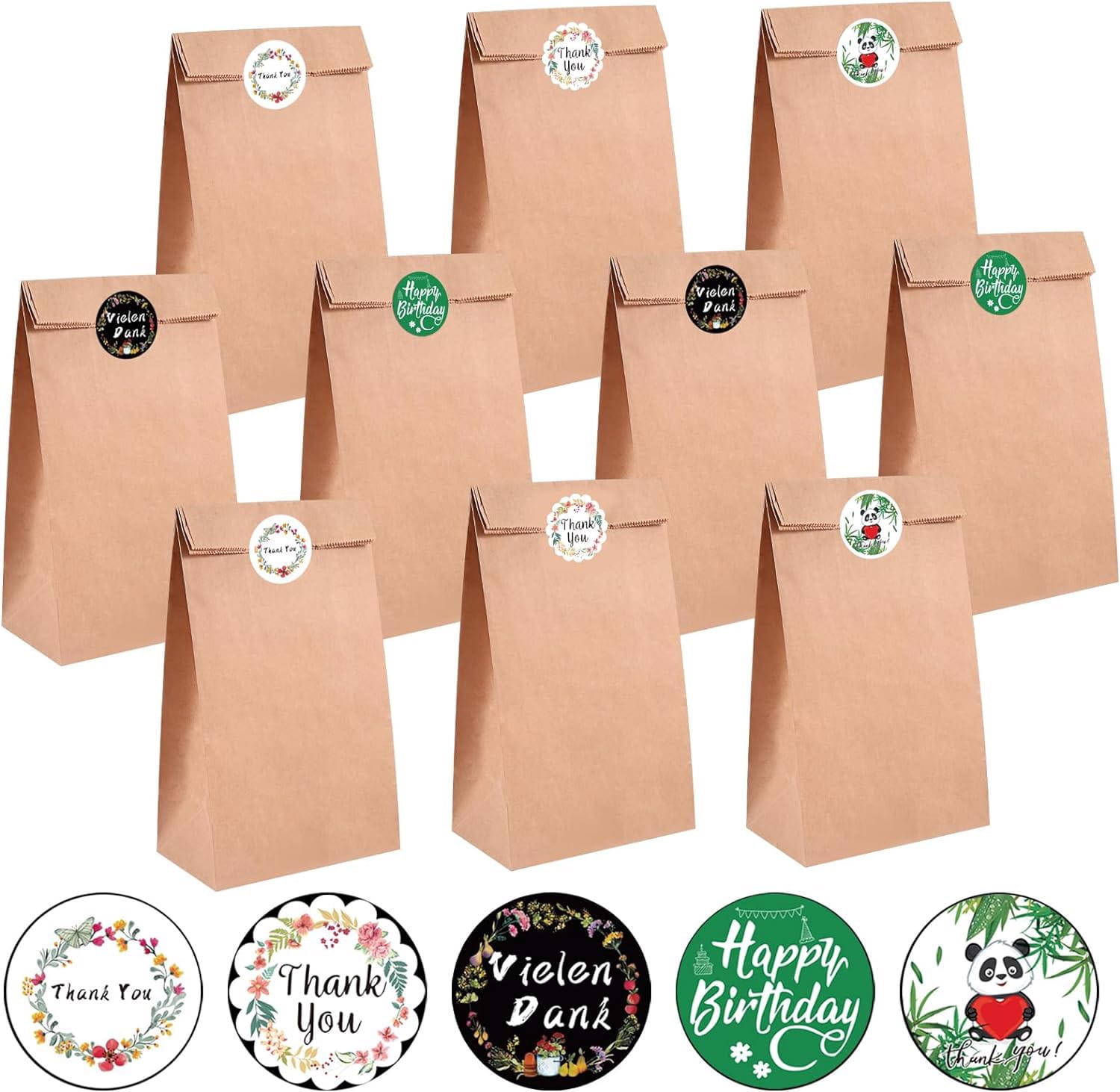 Opakowanie zawiera: 20 brązowych torebek papierowych o wymiarach 24 x 13 x 8 cm oraz 60 okrągłych naklejek. Naklejki obejmują 36 sztuk z podziękowaniami, 12 sztuk z okazji urodzin i 12 sztuk do zapieczętowania torebek.