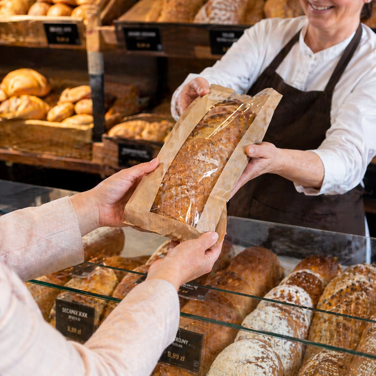 Funkcjonalna torebka papierowa marki KRAM przeznaczona do pakowania pieczywa, wyposażona w praktyczne okienko umożliwiające ekspozycję produktu. Idealnie sprawdza się w piekarniach, sklepach oraz punktach sprzedaży, gdzie liczy się estetyka i wygoda.
