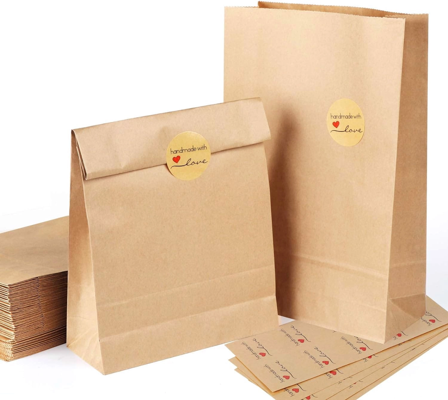 60 sztuk brązowych torebek papierowych wysokiej jakości z 60 okrągłymi naklejkami "Handmade with Love".