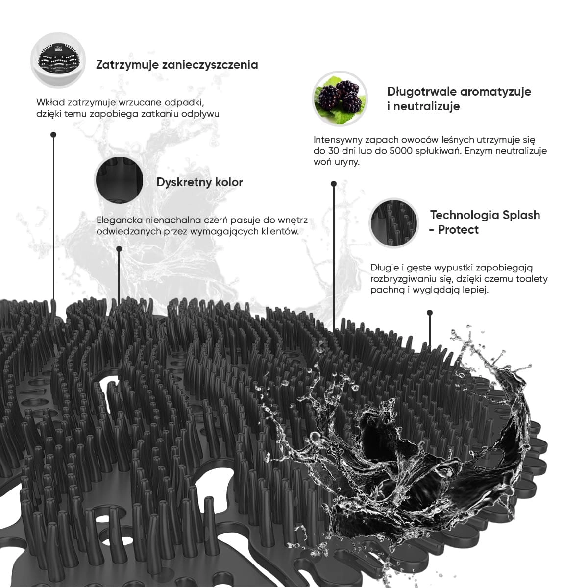 Zostały zaprojektowane tak, aby stanowić skuteczną ochronę przed rozbryzgiwaniem moczu (długie i gęste wypustki), co w konsekwencji zmniejsza zabrudzenia samego pisuaru i w znaczący sposób ułatwia jego sprzątanie.